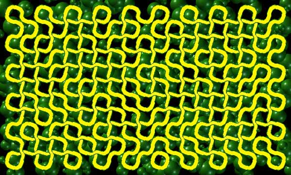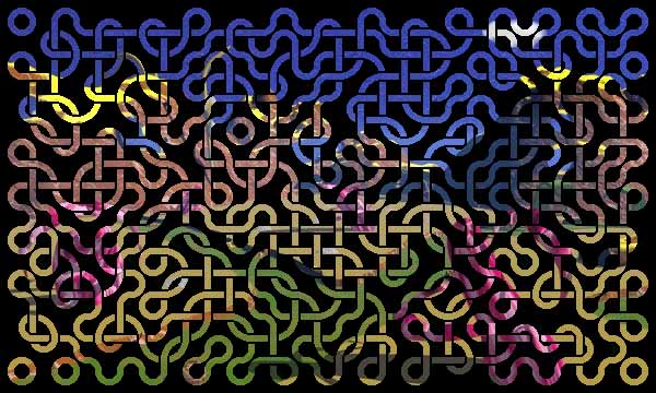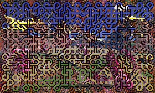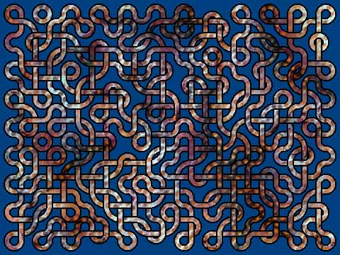 I didn't have much time today, so there's only one image. It shows the first of a new class of substances for making threads: SubstanceImage. These substances are simply based on images (earlier substances were based on code that computed the shape of and rendered the snippets; here the code just copies pictures that have been supplied). For this substance (SubstanceImageTrial, a subclass of SubstanceImage), I used two images: a "straight" section (which actually makes sort of an s-curve), and a "turn" section. These images are rotated to the correct orientation for whatever snippet I'm rendering, and have a mask that lets the background and lower snippets show through. I just threw together the two images in Painter; I haven't made any real effort to make them nice. SubstanceImage is currently rather bare-bones and I will probably be spending some time enhancing and expanding it (so that it's easy to subclass into useful substances). I've also been thinking that I should be rearranging the internals of the whole program a bit so as to make it easier on me in the future. Sadly, hours spent rearranging internals don't yield fun pictures...