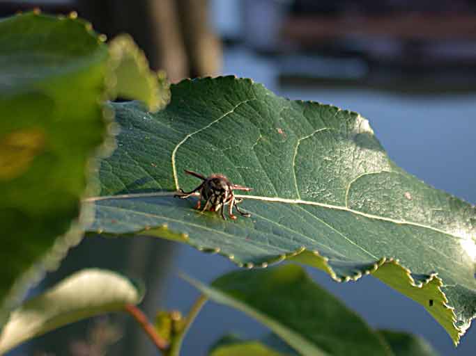 A baldface hornet, eating little bugs off the leaf. There were a whole bunch of these guys buzzing around a couple of similar plants.