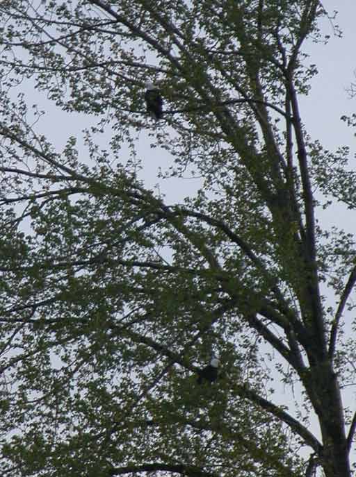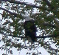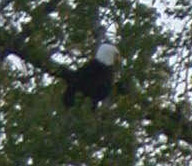There was a week in May when eagles came to Poplar Island, which is just across the river from my place. At one point, we counted nine of 'em in the air. Seems they were following some fish up the river and found the wooded island a good place to hunt from. Sadly, this tree and another (which were on the tip of the island) blew over in a windstorm about a month or two later. Here are details of the above shot, a little contrast-enhanced. I ordered a more powerful telephoto lens for my camera while the eagles were here, but it arrived after they left (and turned out not to be the best quality, anyway). It's times like these that make me wish I had a camera with about 4 to 8 times the telephoto capability that I have.