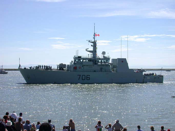 A motoboat amongst the sails. The HMCS Yellowknife, a 181-foot patrol frigate.