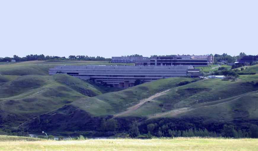 The University of Lethbridge, nestled in the coulee. The main building (University Hall), shown here, was designed by Arthur Erickson. Erickson is a Vancouver architect, who also designed the main part of Simon Fraser University, where I work. |