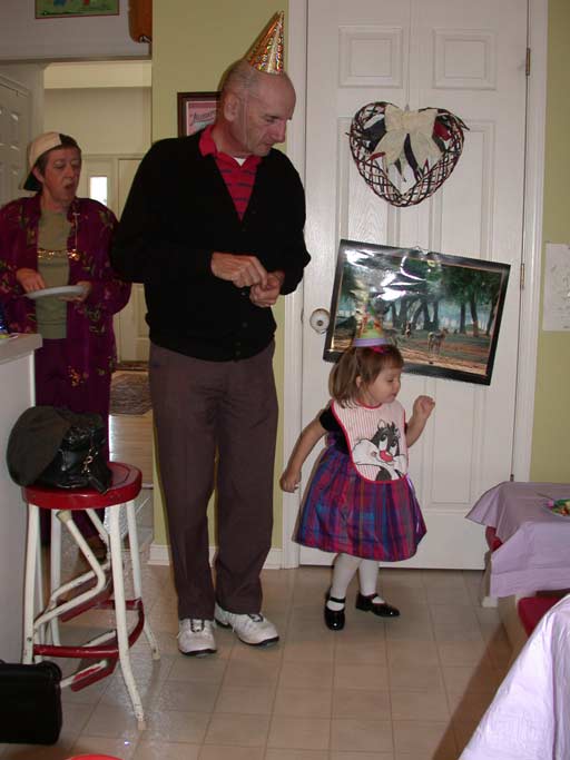 My niece Chloe does a birthday dance with grandpa Fuzzz as grandma Linda looks on.