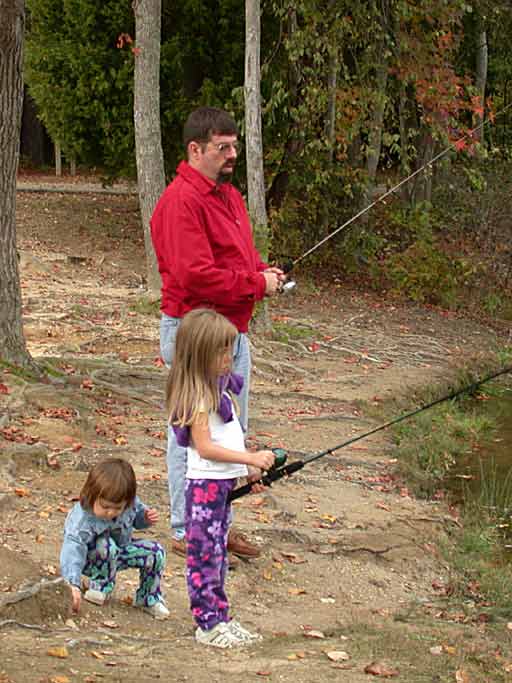 Papa Sam fishin' with Sydney while Chloe looks for a pebble to throw into the water.
