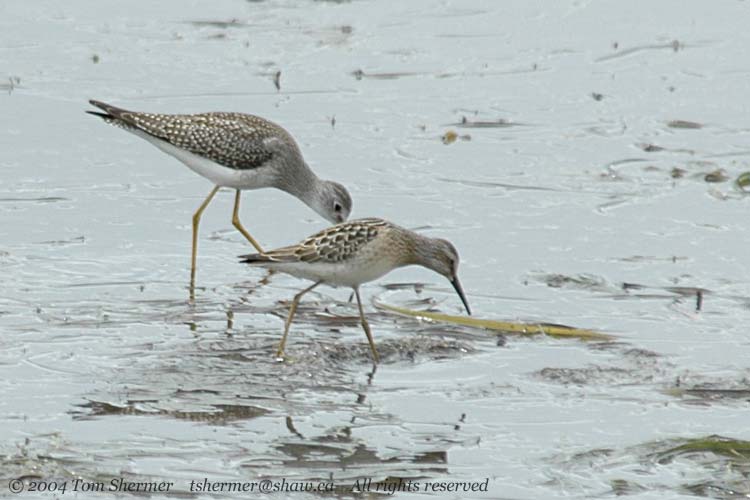 Sandpiper. The rear bird is either a Lesser or a Greater Yellowlegs,