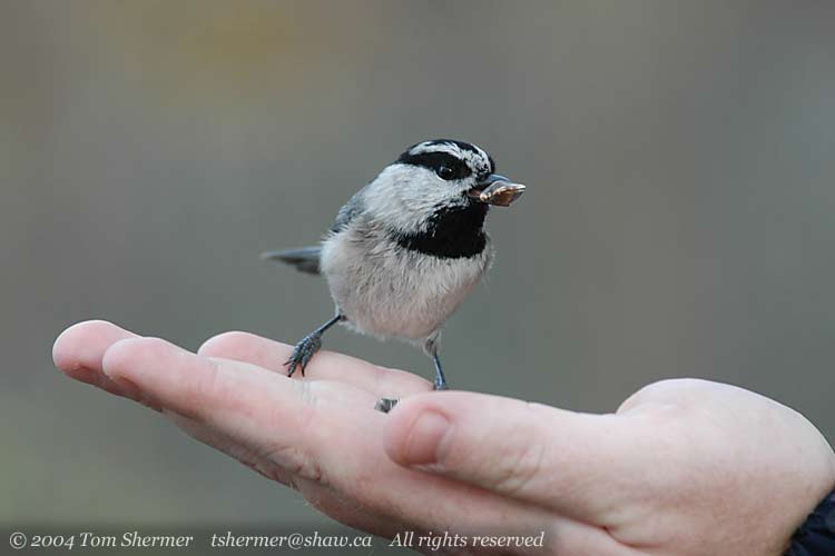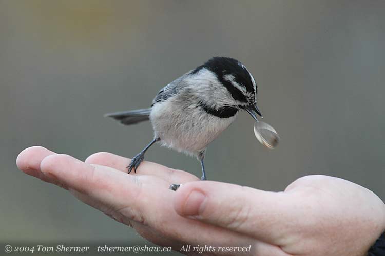 sunflower seed in its mouth. For most chickadees, sunflower seeds