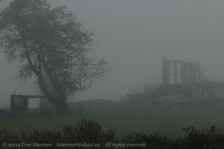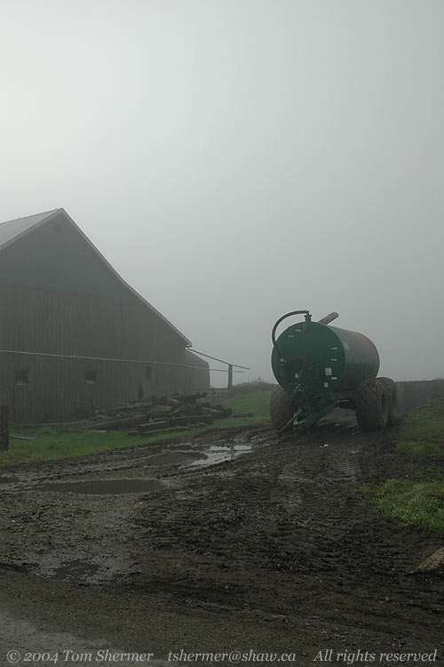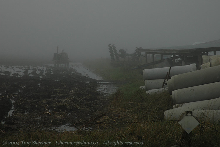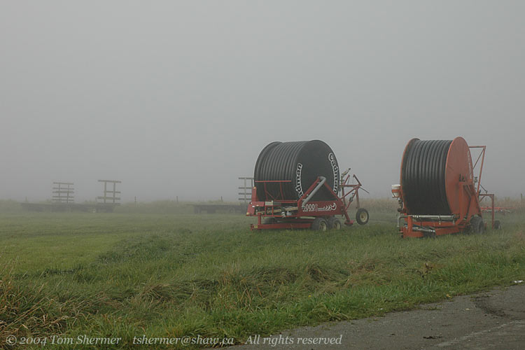 in the fog. Here's a farm field with a couple of spools of irrigation