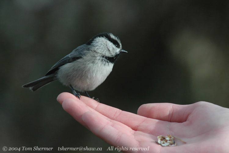 on his fingertips is a Mountain Chickadee. I had a similar photo