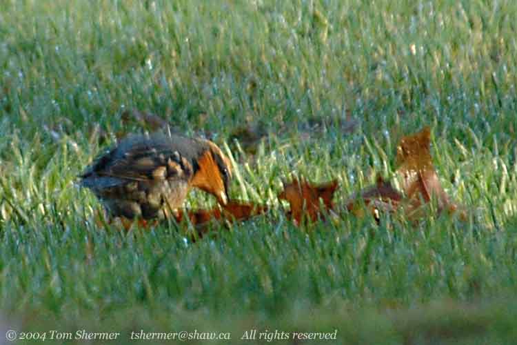 in the peanut feast, a Pine Siskin at a feeder, and a Varied Thrush