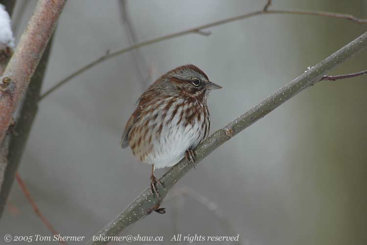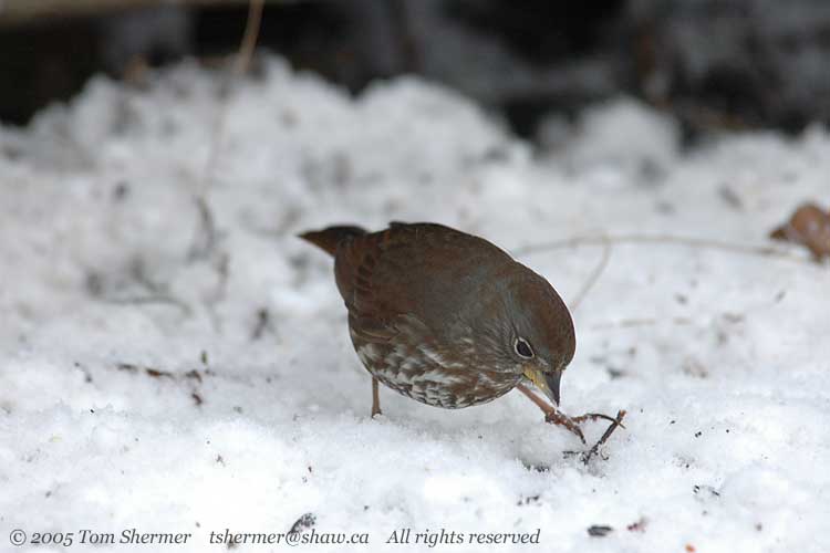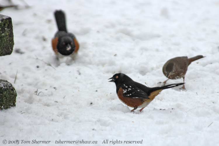 Spotted Towhees and a Song Sparrow, scratching around on the ground,