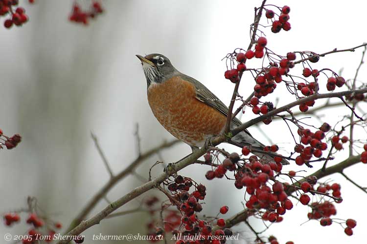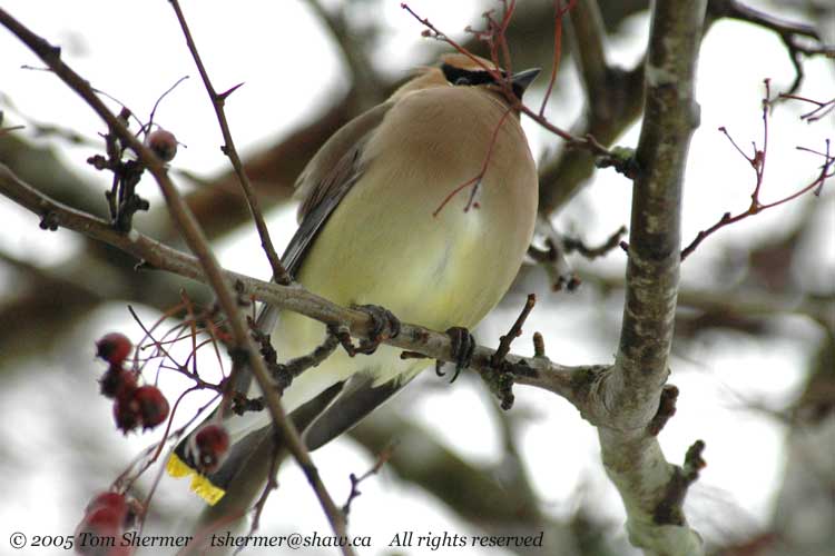 and a trio of Cedar Waxwings eating berries from a nearby tree.