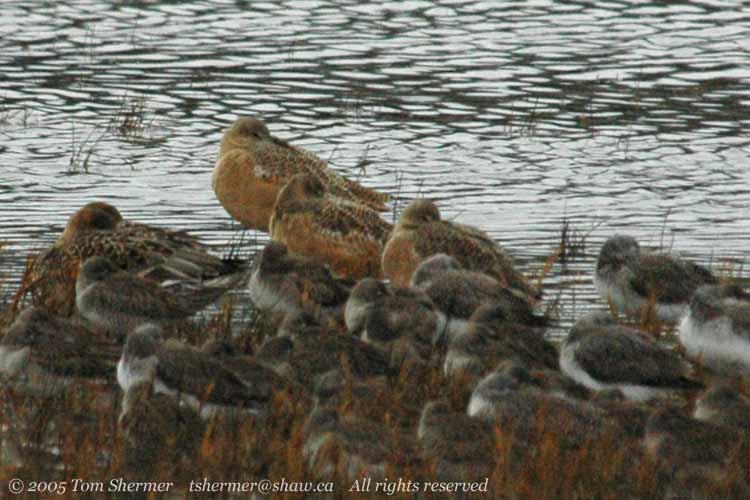 three Marbled Godwits hanging out with some Long-billed Dowitchers