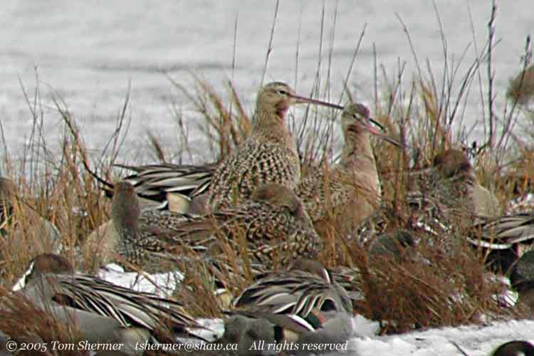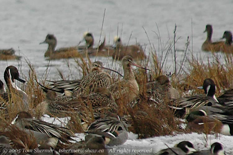 Long-billed Curlew were, surrounded by a mass of dabbling ducks.