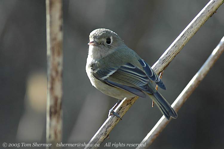 following photo shows a Hutton's Vireo. The kinglet and vireo often