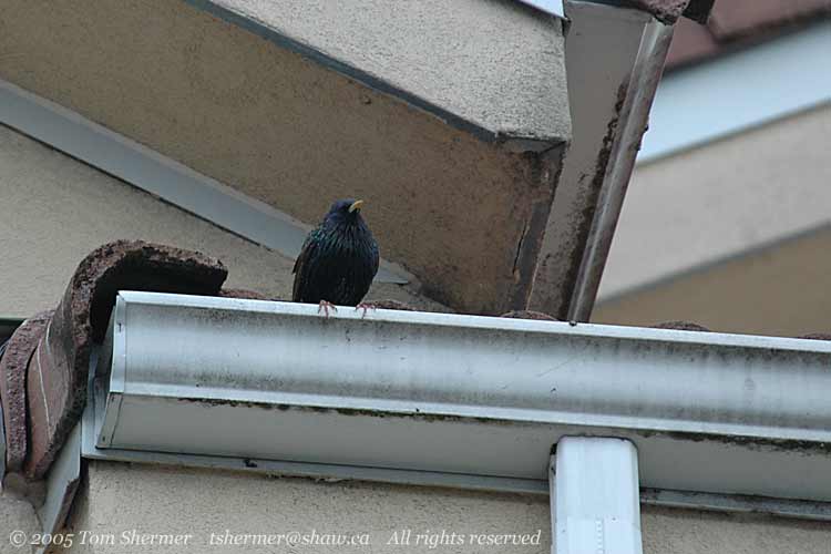 of my building, I found a European Starling perched on the gutter.