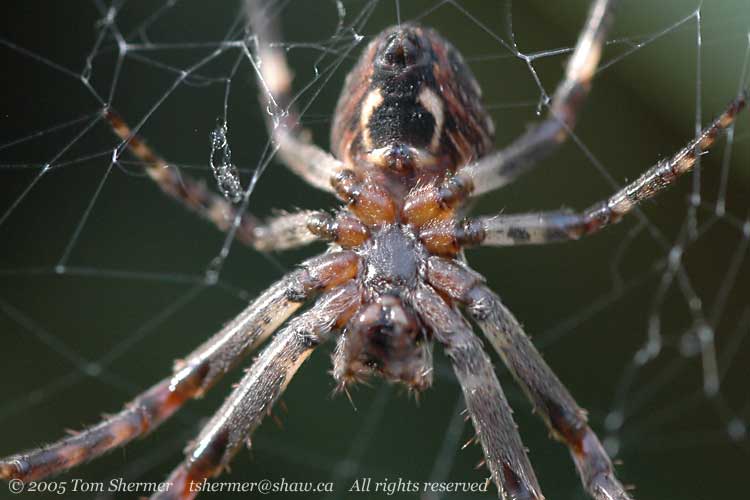 legs are arranged, and the camouflage color patterns on its abdomen.