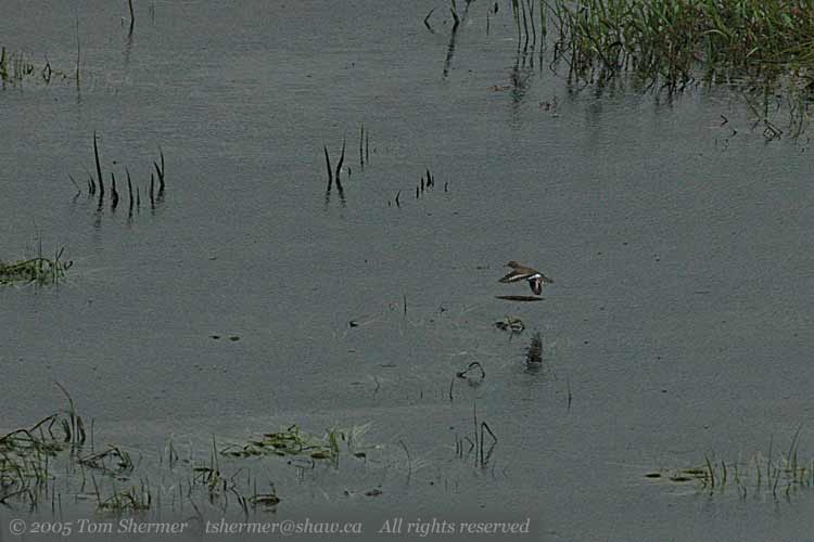 of Spotted Sandpipers flying around over the water. Here's one of