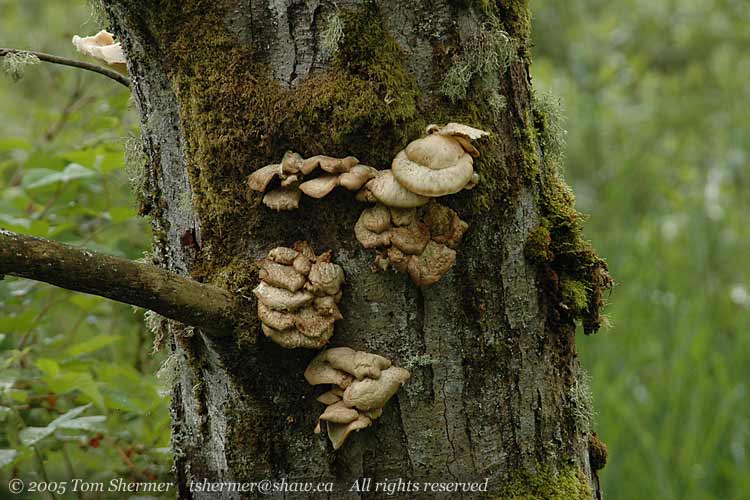 very droopy mushrooms on the side of a tree.
