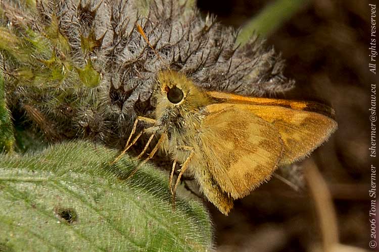 I found a fuzzy Woodland Skipper on a fuzzy leaf on a fuzzy plant. |