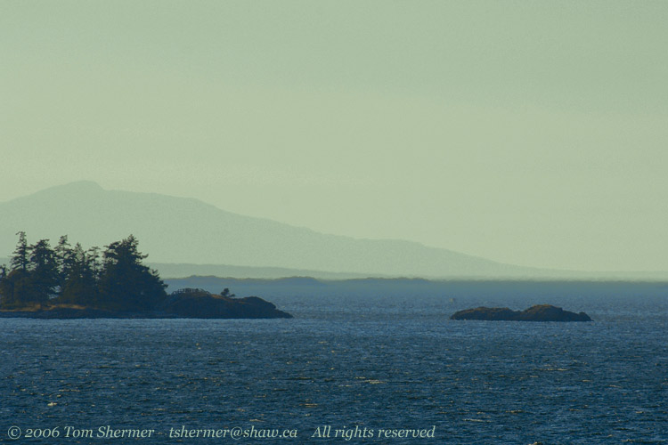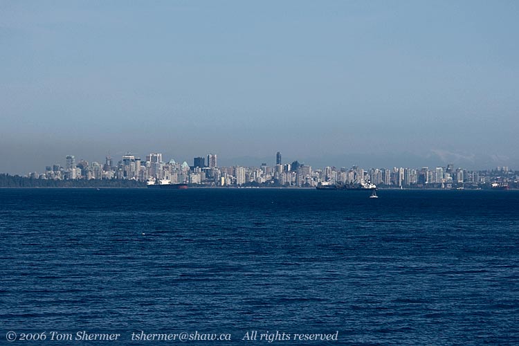 On the 21st of August, I went and got on the ferry to Nanaimo, heading for a short but much-needed vacation. I had some ideas of things to do on the island but no set plans.As we left Horseshoe Bay, I went to the outside deck of the ferry to see if there were any good birds around. I didn't find any, and so I grudgingly took a few shots of Vancouver as it receded in the east. |