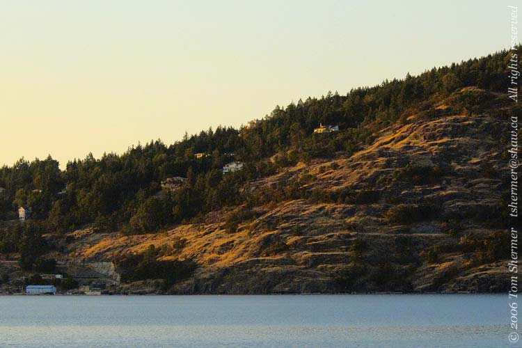 I went to an inside deck for the rest of the ride over. Once on the island, I drove north, as my plan was to eventually make it up to somewhere near the northern tip of the island. As I was driving, it became the early evening and I was treated to some really juicy but fleeting colors on the hills and mountains to the east. Here's one such scene, where I was able to get to the side of the road both safely and quickly enough to capture some nice browns and oranges. |