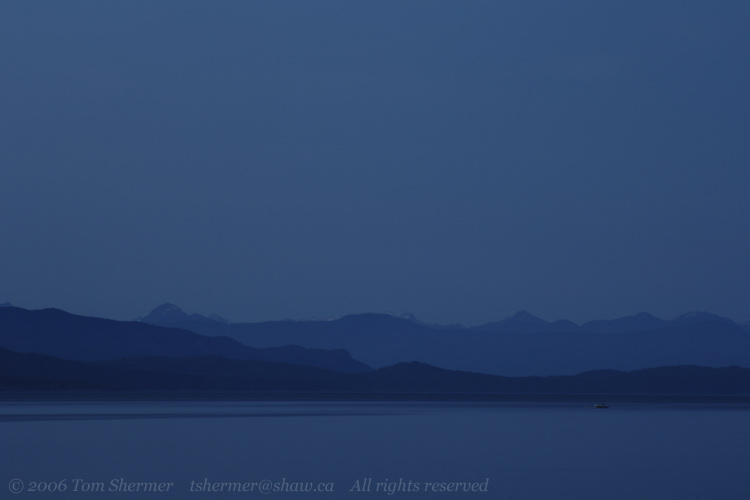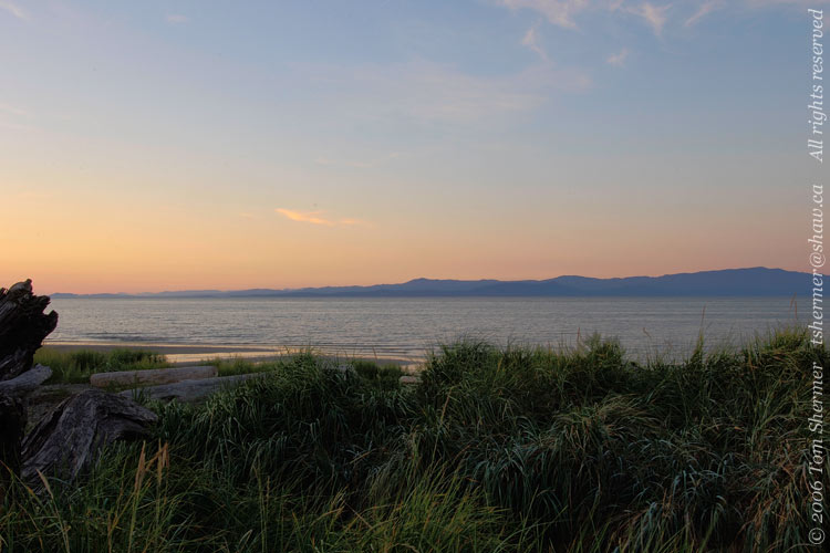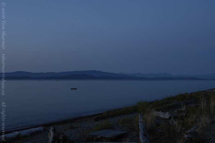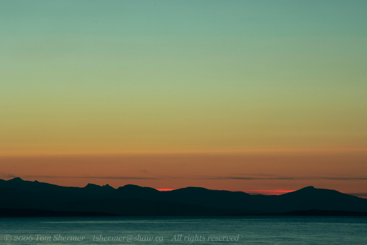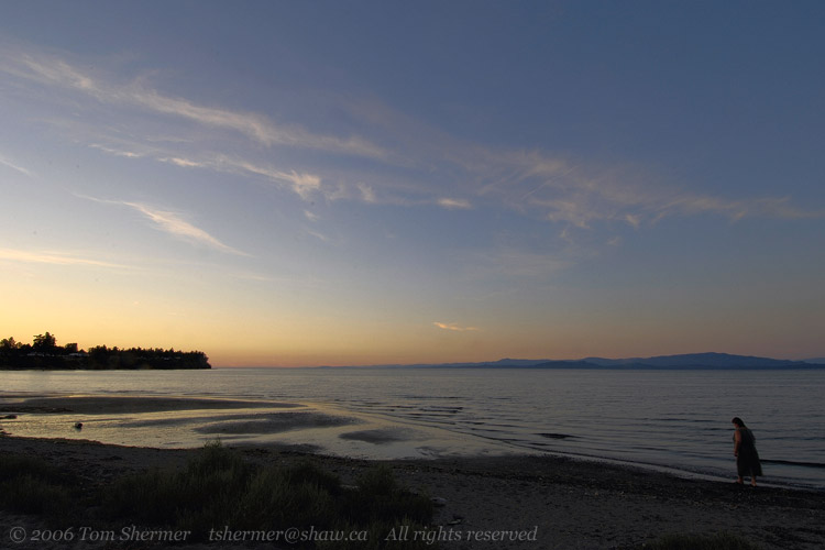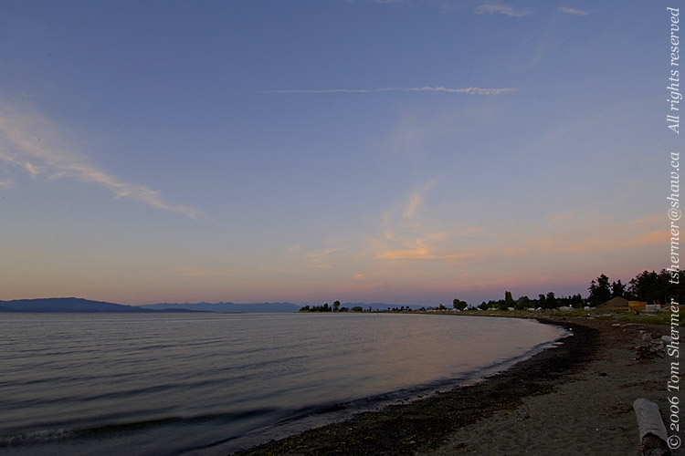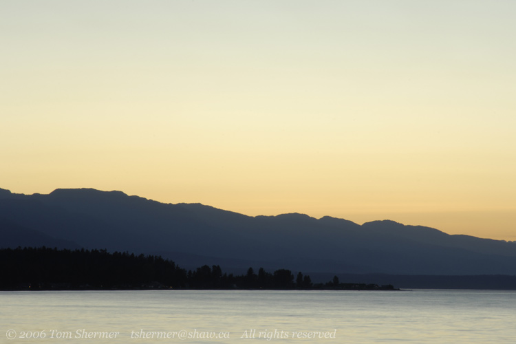 A short time later, I found myself looking eastward from the shore in the town of Qualicum Beach. The sunset colors were already coming out. |