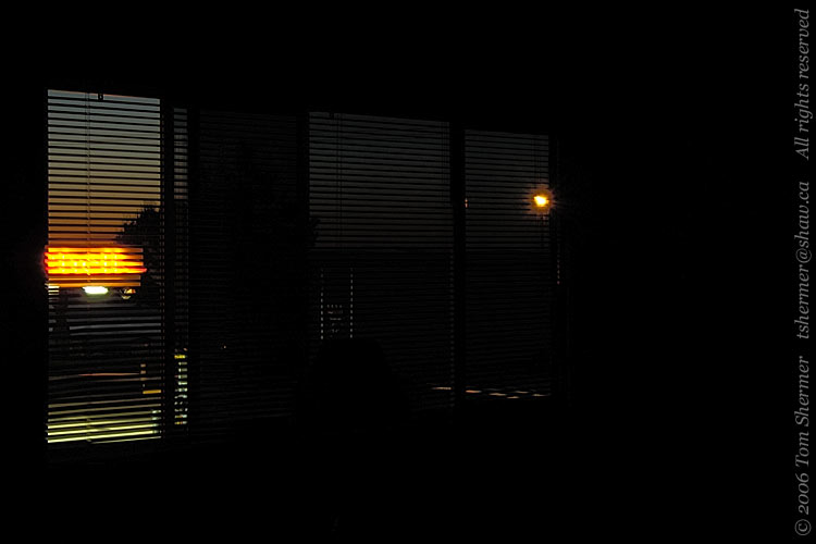 The sunset colors and neon lights through the blinds were what had drawn me to the subject, but their dominant effect on the view just didn't show up in the photo. I'm still not sure what I would change to get the photo to turn out right. Sometimes it's like that, I guess.