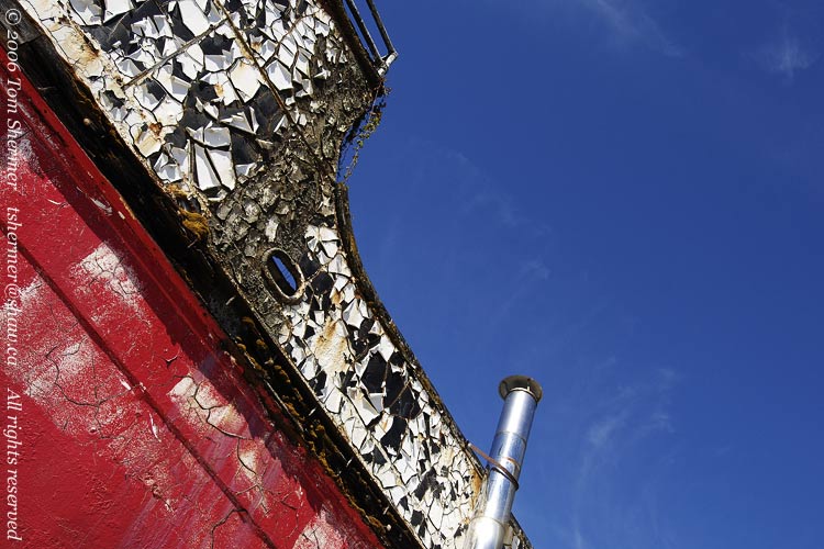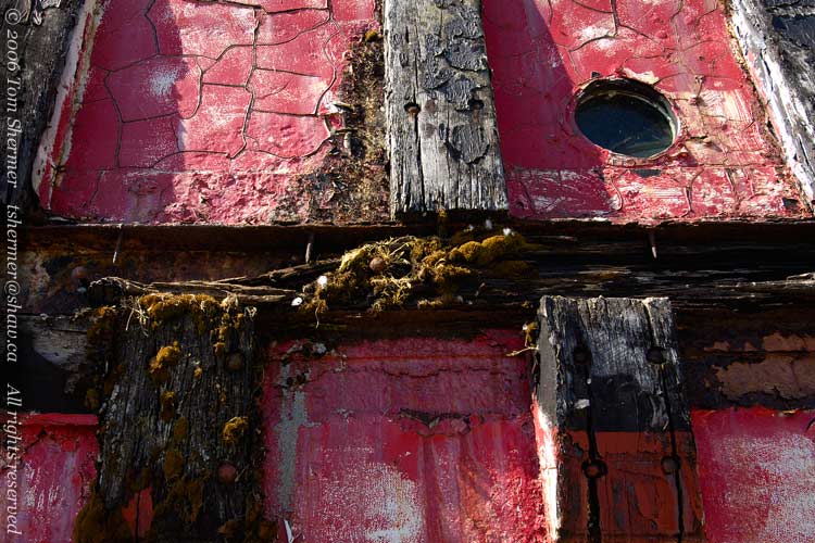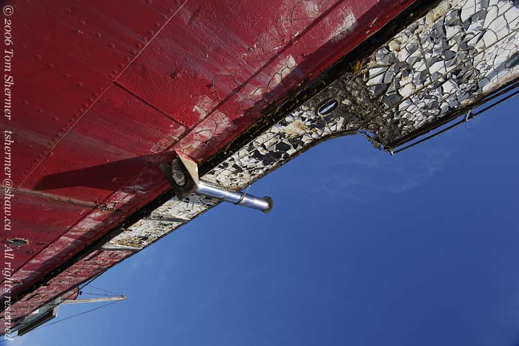 The port side of the boat, which faced the water, had a luscious coat of cracked and peeling paint, and I really wished I had a ladder with me so that I could have gotten some straight-on photos of it. I had to settle for what I could do, which was wide-angle shots from nearby and below it all. |