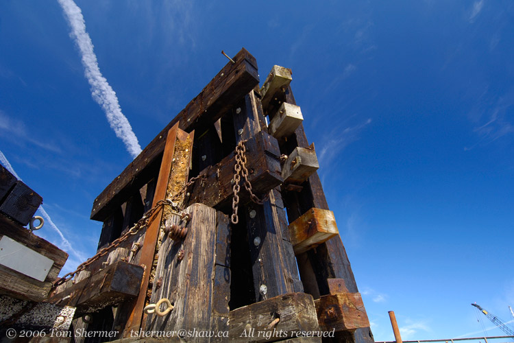 I walked along the rocky beach a very short ways, and came upon what looks to be a marine bumper of some sort. I've seen larger versions of these sorts of things at ferry docks, to hold the ferries in place. It took some moving around and stepping on algae-coated things to achieve the dramatic perspective and to get the contrail in the right spot in this shot. |