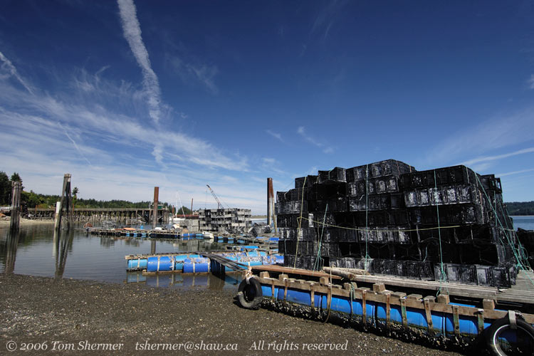 In my subsequent researches, I've discovered that Fanny Bay is a well-known oyster production locale, so maybe the black boxes were oyster traps. You could take these traps out and drop them in the water, and all the oysters would crawl around and jump in them. Then you pull 'em up.