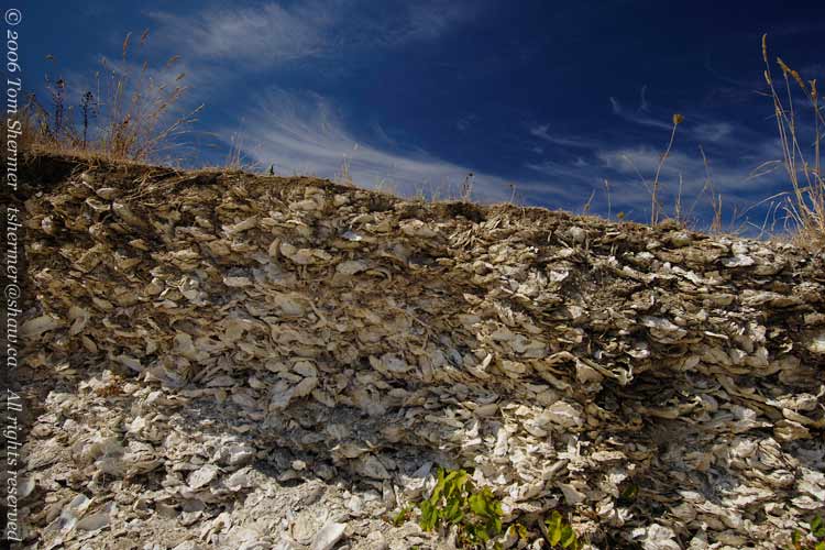 I headed back towards my car. On the way, I encountered a half-meter-or-so dropoff that I would have to mount. The dropoff was interesting in that it revealed that the land above was composed of a thick layer of (oyster, I presume) shells. |