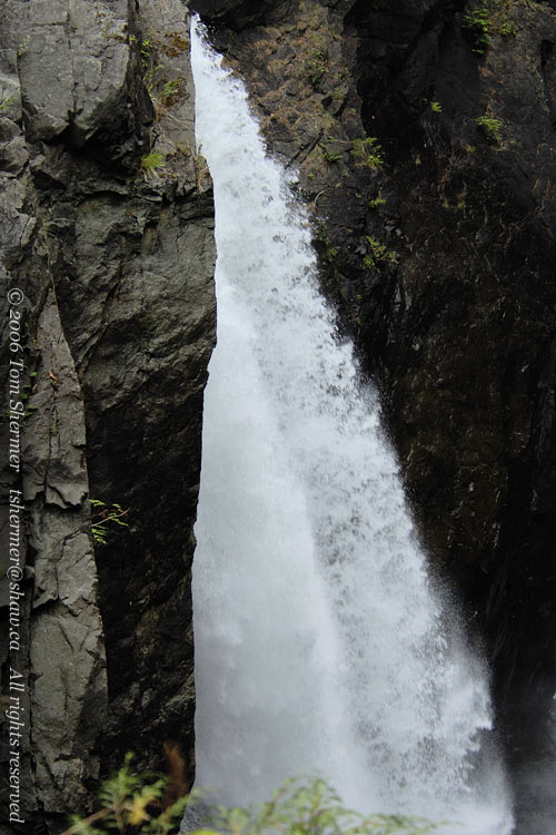 Soon I came upon the turnoff for the campground, but the falls themselves were farther along. After a wrong turn that got me to an electric generating plant, I eventually made it to a gloomy parking lot somewhere in the woods. Following a path down from there, I made it to a lookout on the side of the falls. |