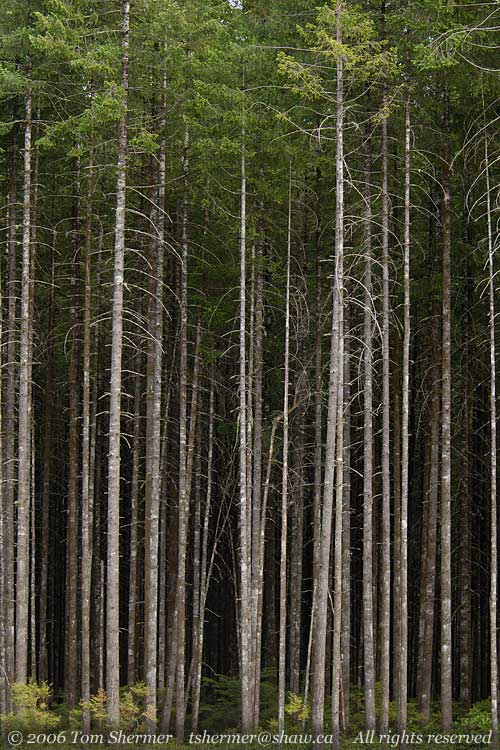 As I got back to the park entrance, I was taken with the woods on the side of the road opposite me. There were lots of tall evergreens there, but only the tops of them had any needles. These tall, straight trees are Lodgepole Pine. It was nice to have a clear view to such a tall stand of them. |