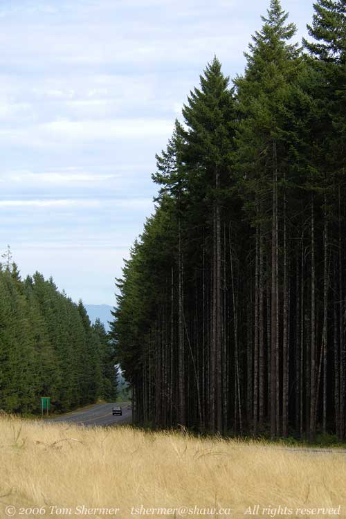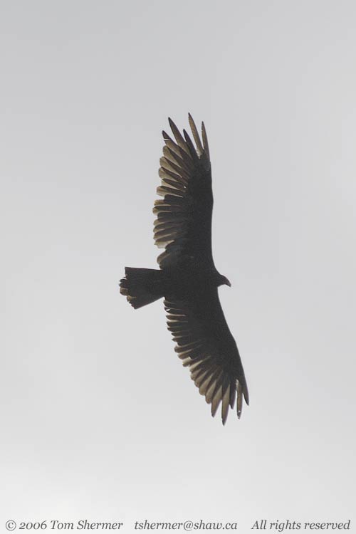 My goal for the day was Port McNeill, the next-to-last town on the road north. I had motel reservations for a few days there. Unfortunately, between Campbell River and Port McNeill, the road is inland, and so I didn't see any other neat coastal stuff. About the only thing I encountered the rest of the way was an occasional Turkey Vulture gliding over the road. |