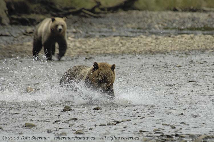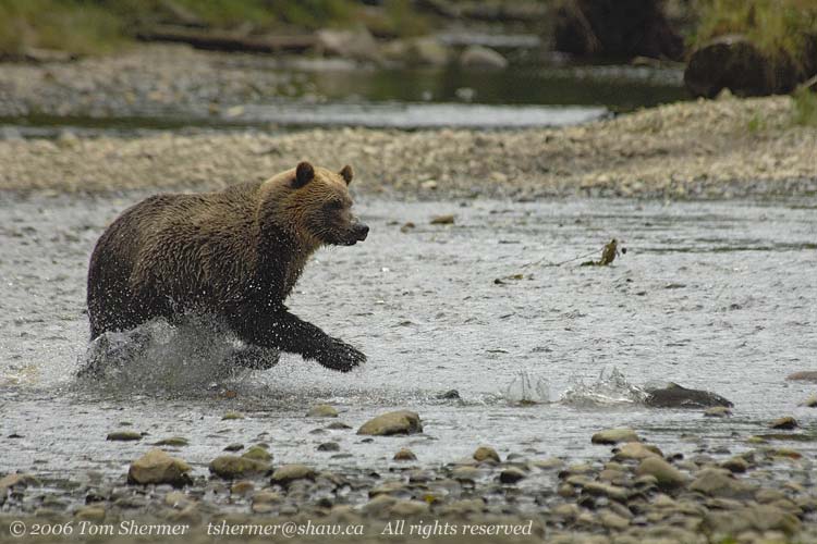 That something actually shows as a horizontal line of white in the water, some splashing, and the dark spot in front of the bear in the above photo. |