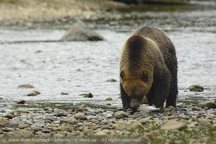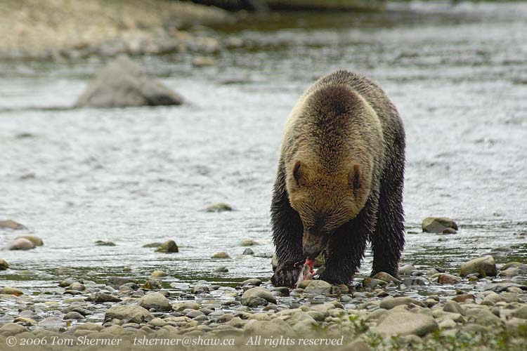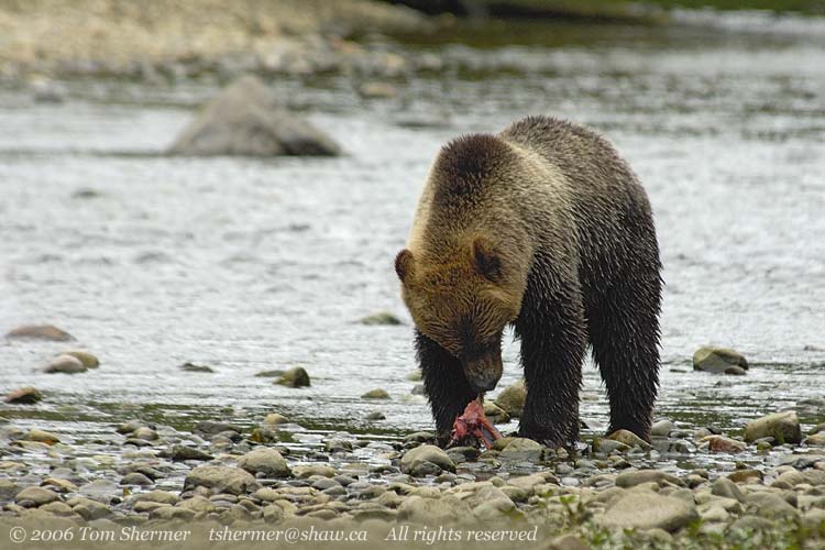Once the bear got his catch up to a slightly drier area, he put it down in order to consume it. I guess it was time for lunch, after all. |