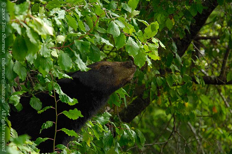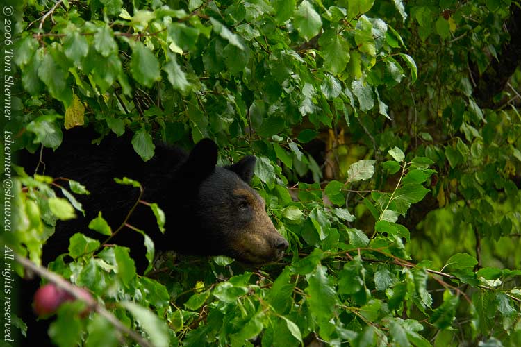Well, maybe I should engage in a little educational spiel here. I I was standing on a wooden footbridge, about two meters above the ground. I was shooting upwards at this bear. The bear was above me. He was in the tree. So please remember these pictures next time you're out in the woods, a Black Bear is chasing you, and you're tempted to climb a tree to try to get away from him...for Blacks can not only climb plum trees, they can climb just about any tree.