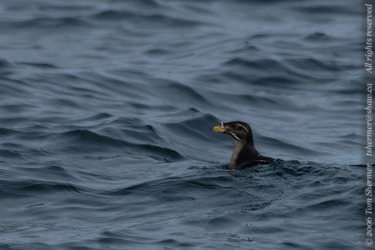 That was around 4:00; from there we motored along. About fifteen minutes later, we had slowed down for some reason. I looked around and saw no visible reason for us to have slowed, but then I'm not a boat captain and don't know what to look for. While I was looking around, I did notice a Rhinocerous Auklet fairly close to the boat, and because we weren't bouncing across the waves, I was able to get a few decent shots. |