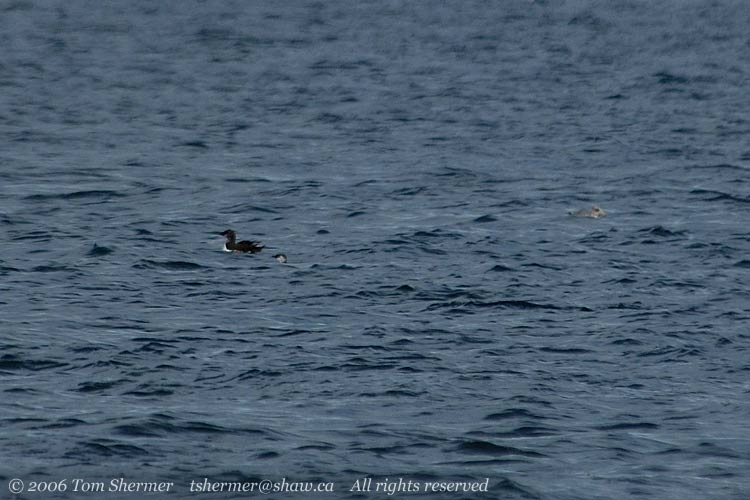 A little later, a little farther out, there were a pair of Common Murres, which were a lifer for me. When I took this photo, I knew the birds looked different than anything I was familiar with, but I didn't find out until later what they were. This photo shows the two murres on the left half, and what looks to be a California Gull on the right. One of the murres is behind a wave, and only its head is showing. |