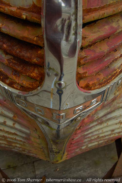 Here's the front grille. When a photographer shoots a chrome piece straight on like this, they generally have to expect a reflection of themselves and their camera in it, and often try to position themselves so that the reflection is unobtrusive or invisible. Here I didn't have to worry much about that, as the point or crease in the part turned me into a very thin, wispy, unrecognizable fellow, with a bit of a blob for a torso. |