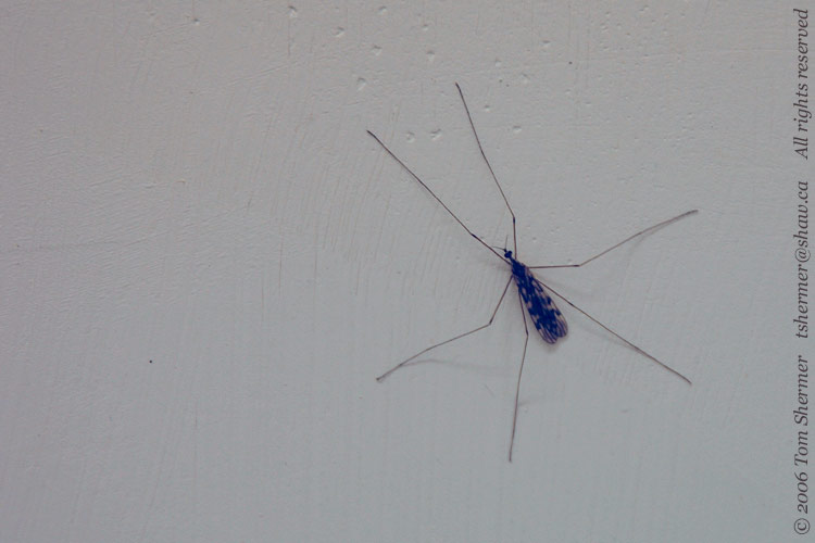And here's another, showing a Crane Fly I found on a cement wall near the parking lot. There are about 15,000 species of Crane Flies worldwide, so I'll leave further identification of this one to the experts. He did have nice patterned wings, though; most of the Crane Flies I see have completely clear wings. |