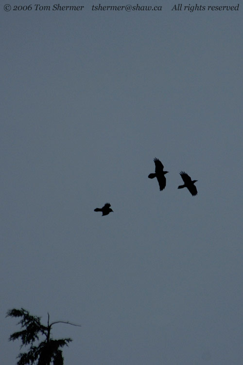 A little after 6:00 I headed back to Port McNeill, where I had a motel room. On the way, I caught my last photos of the day when I noticed some Common Ravens flying across the road, above the trees. It had gotten dark enough that all I could get was silhouettes. |