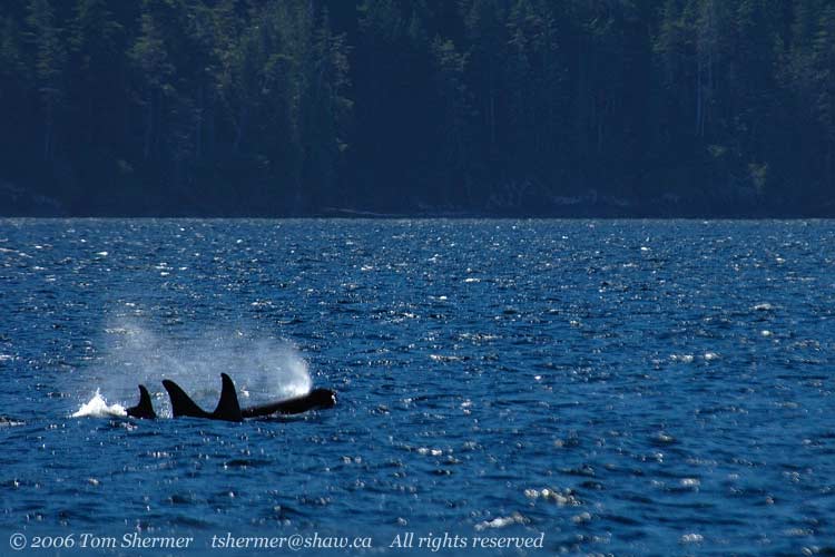 Here's a group of three (two adult females and a juvenile) swimming closely together. These three are undoubtedly related; Orcas associate very closely with family members. |