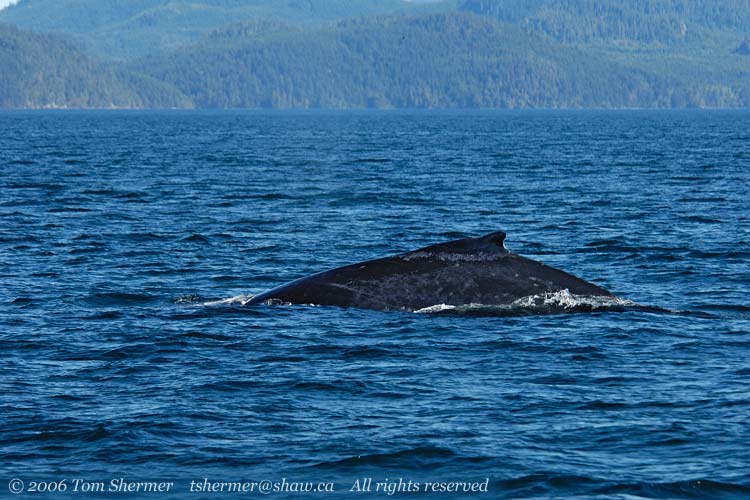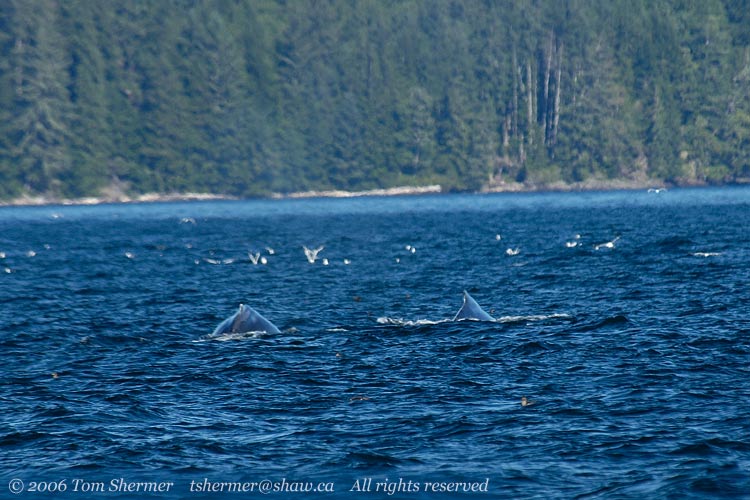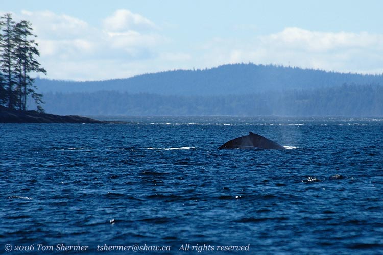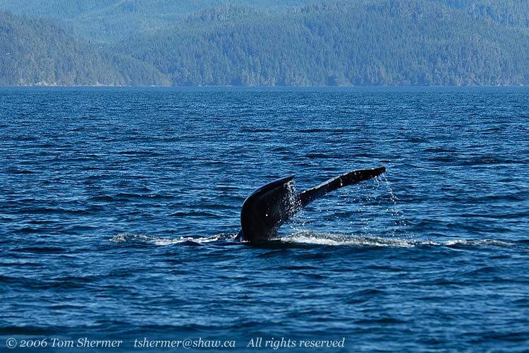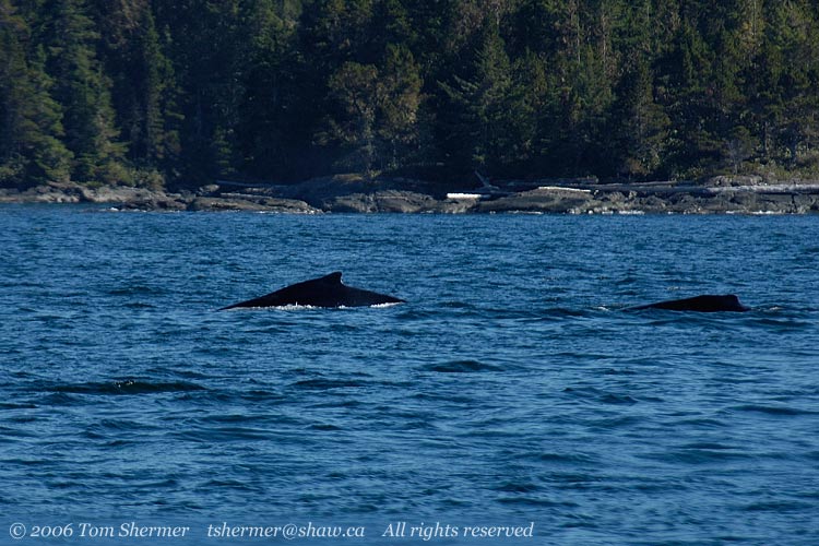 A classic type of whale photo (particularly of Humpbacks) are shots of them raising their tail high in the air as they dive. It turns out that these shots can be quite hard to get (particularly in jurisdictions like British Columbia, where you can't run a motor within a certain distance of a large marine mammal). The young Humpback wasn't diving, and the older one wasn't diving much, preferring to stay with the young one. When she did dive, she really didn't raise her tail high. So the situation was not favorable to getting any really good whale-tail shots.