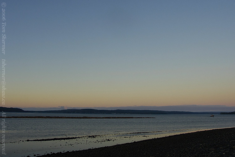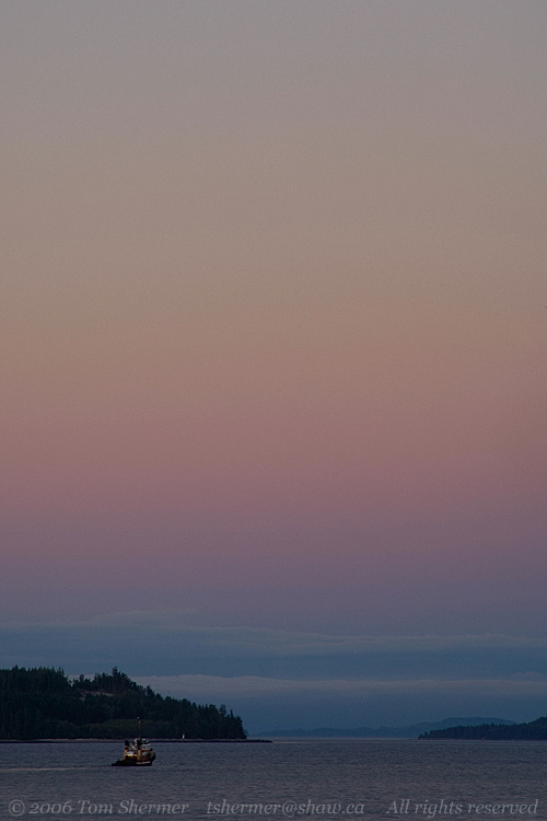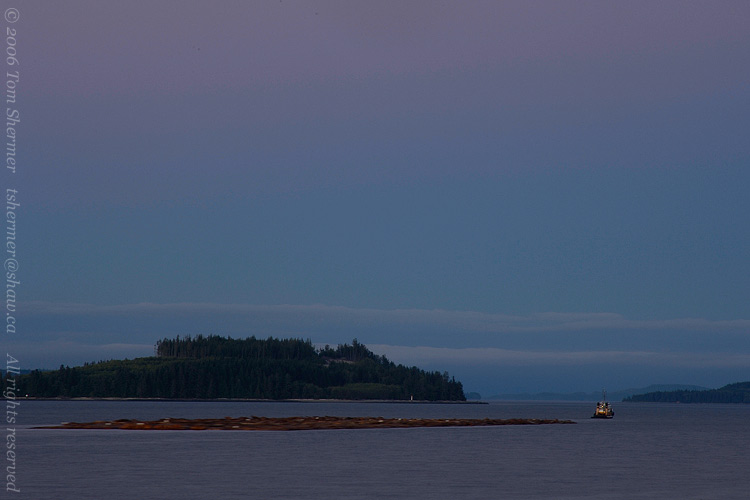I walked past all the boats and ferry dock to the other side of the waterfront, which has a beach and a nice view of an island (Malcolm Island, I presume—the one Sointula is on). A tugboat was pulling a raft of logs along the shore, and that made a nice addition to some eastward sunset photos. |