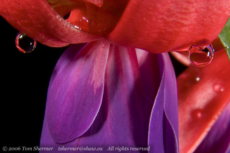 I started with some shots of a fuschia; this one was hanging off the side of a hanging flower basket. |