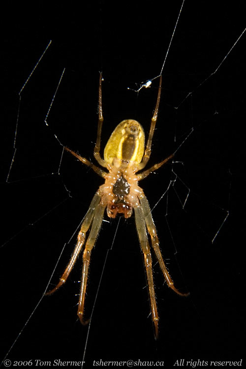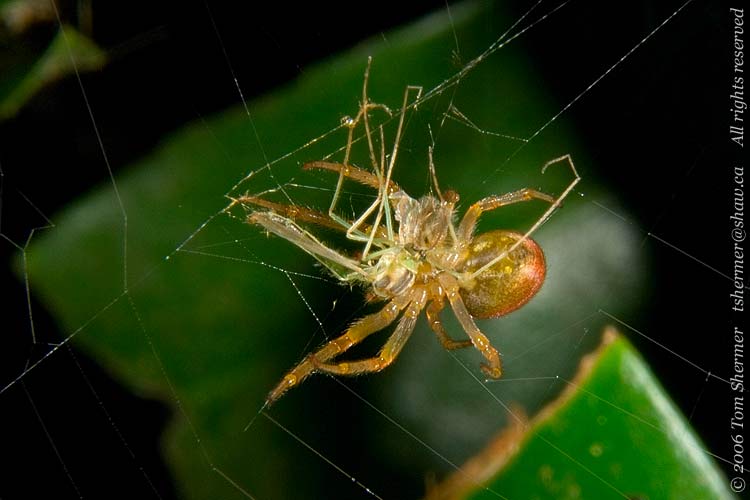 But I soon found an interesting little bit of life history going on in the nearby bushes. A spider had caught a fly of some sort (judging by the legs, another midge, or a mosquito) in his web, and had just come over to dispatch him. |