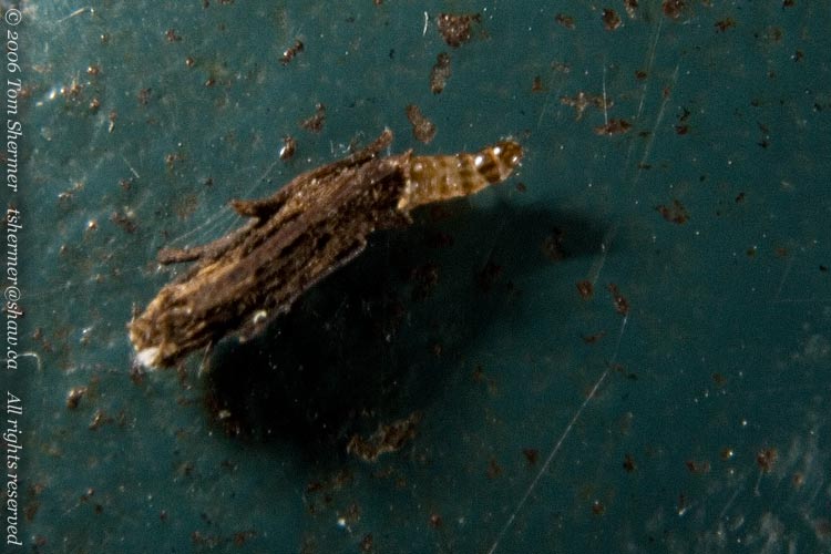 But this next little fellow was a surprise. I found this guy on a handrail on some stairs to my building. Best as I (and the people whom I consulted on the matter) can tell, this is a Bagworm Moth (a moth in the family Psychidae). |