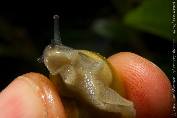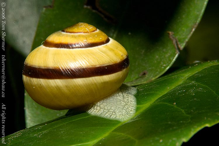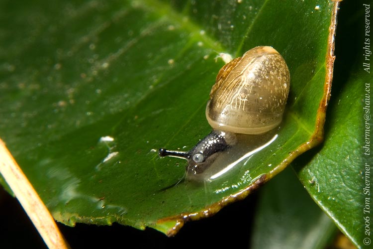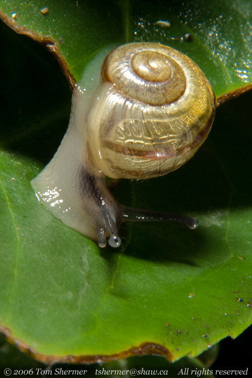 There are structures visible at the entrance to a snail's shell, such as the apetural lip and the parietal denticle, that help in identifying them, but you can't really see those in this photo, as the animal is still outside of the shell, blocking our view of the entrance. He didn't seem to want to withdraw all the way.