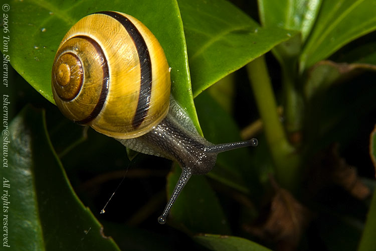 Soon I started finding snails all over the bush I was standing next to. Here's one headed the other way. |