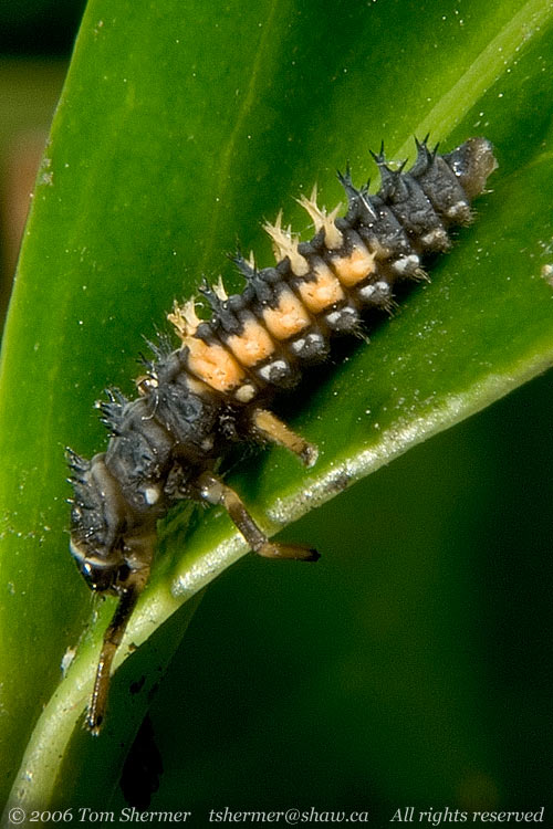 Another critter I found a bunch of on the same bush was the Multicolored Asian Ladybug (Harmonia axyridis). This next one's a larva. I was happy at how close I was able to get to him with my macro lens. |
